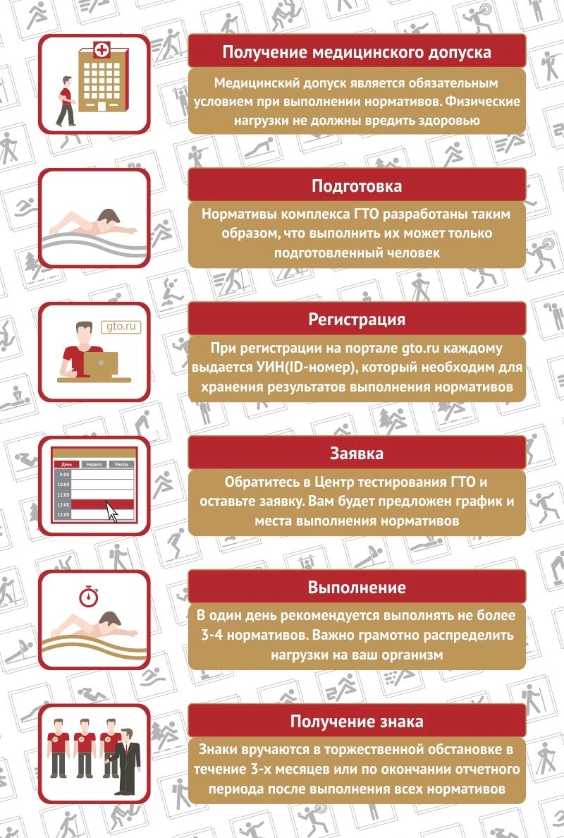 Для участия в акции нужно: о зарегистрироваться на официальном сайте https://user.gto.ru/user/register и ознакомиться с нормативами комплекса в соответствии с вашим возрастом; и начать подготовку к сдаче норм ГТО. Спортивных достижений!