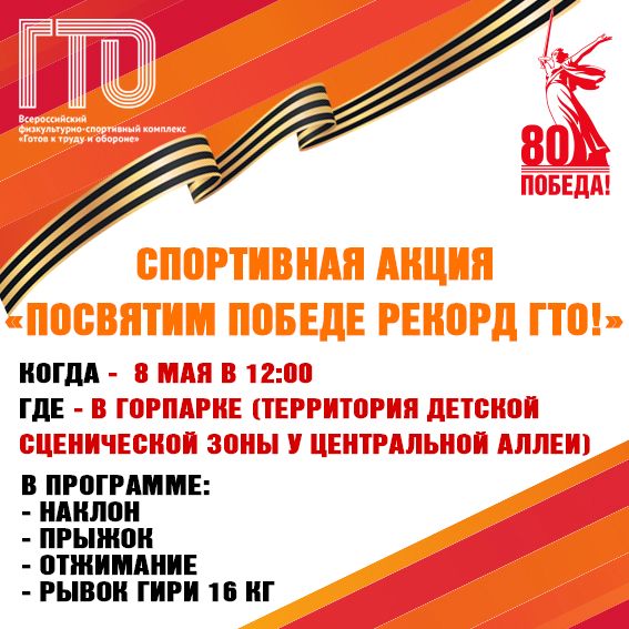В Белогорске вновь проведут спортивную акцию «Посвятим Победе рекорд ГТО!». Она приурочена к празднованию 80-летия Победы в Великой Отечественной войне. Мероприятие организуют 8 мая. По традиции работу мобильной площадки ГТО развернут в горпарке на территории детской сценической зоны у центральной аллеи. Начало в 12:00.