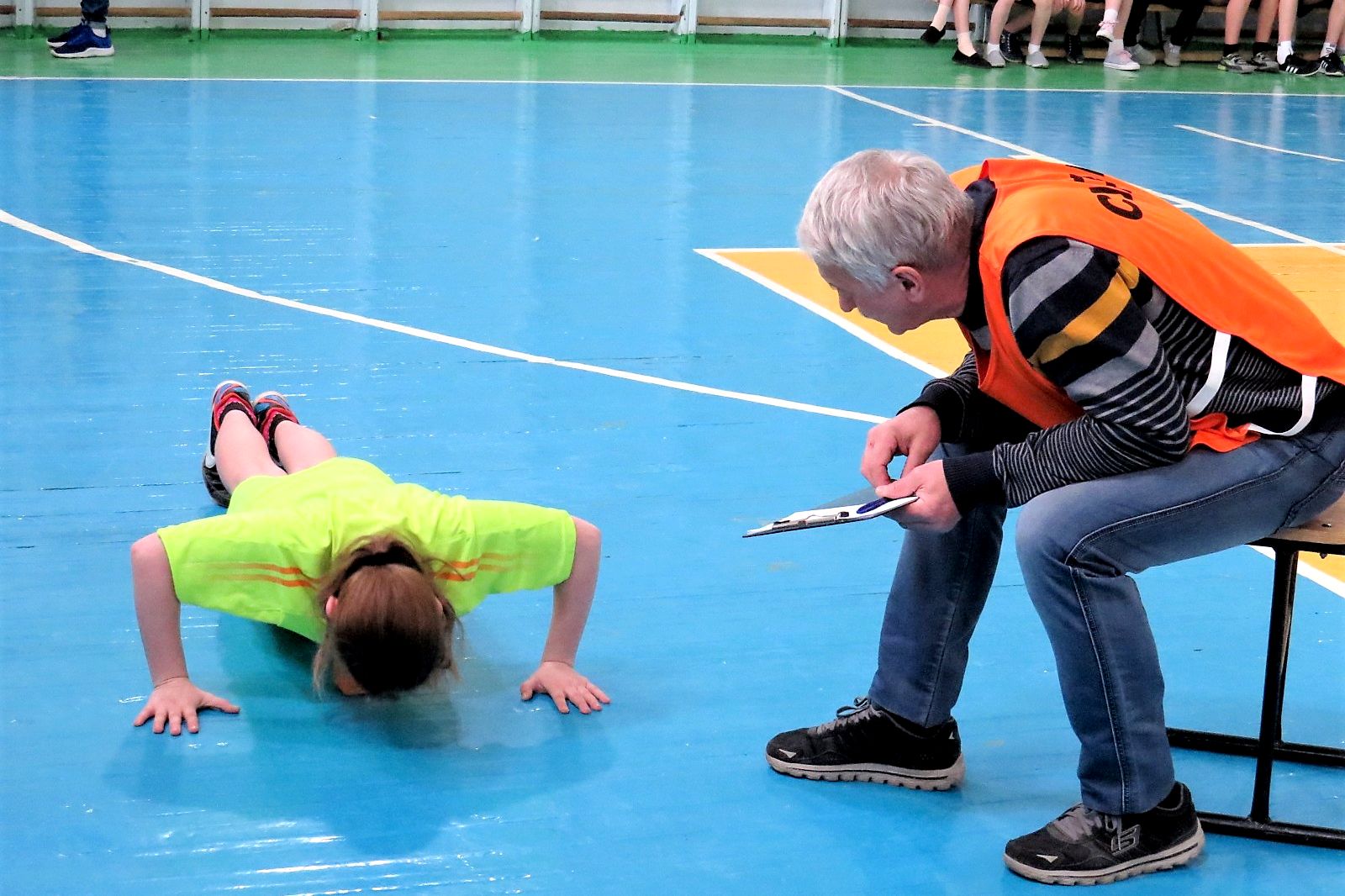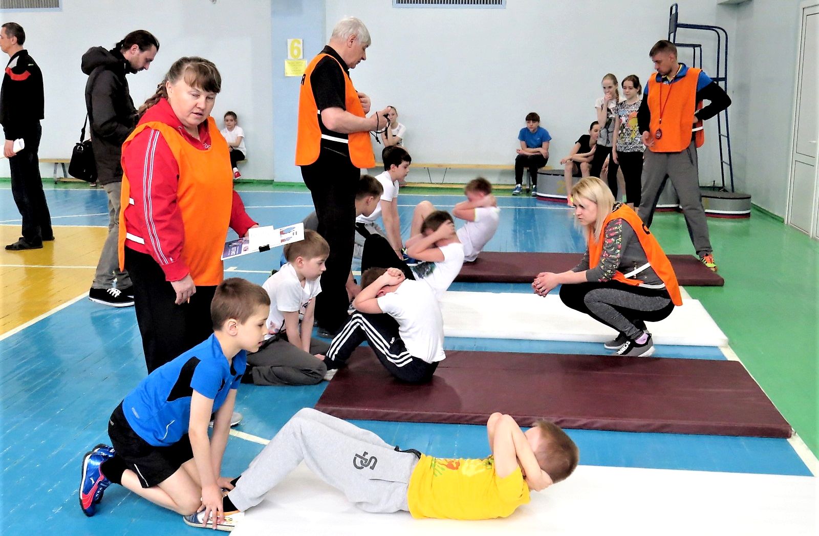 Более 90 человек, воспитанников детско-юношеских спортивных школ, в возрасте от 9 до 12 лет смогли попробовать свои силы в подтягивании из виса на высокой перекладине, в поднимании туловища из положения лежа на спине, в сгибании и разгибании рук в упоре лежа на полу, в наклонах вперед с прямыми ногами на полу, прыжках в длину и в броске набивного мяча из-за головы из положения сидя.
