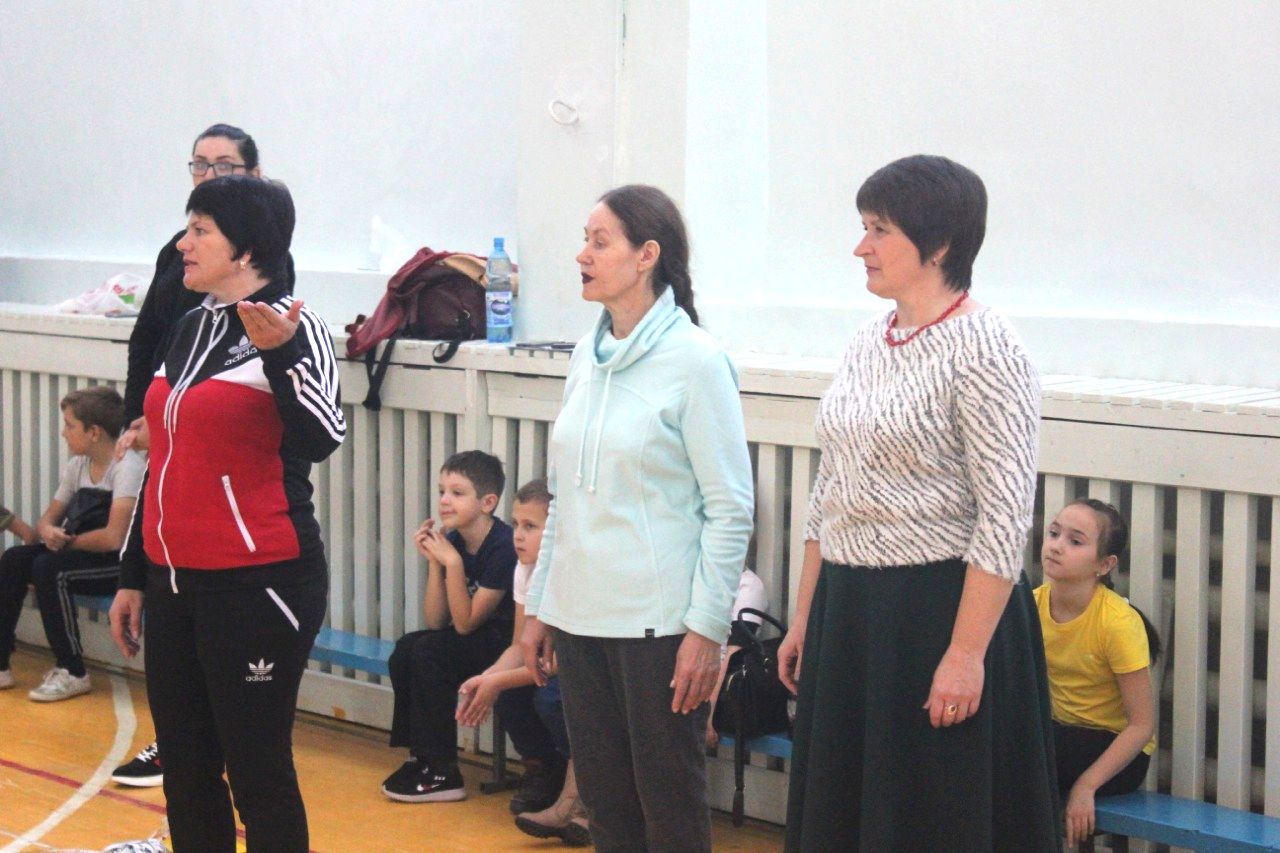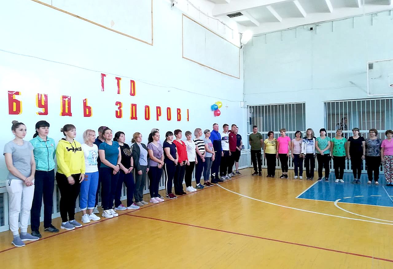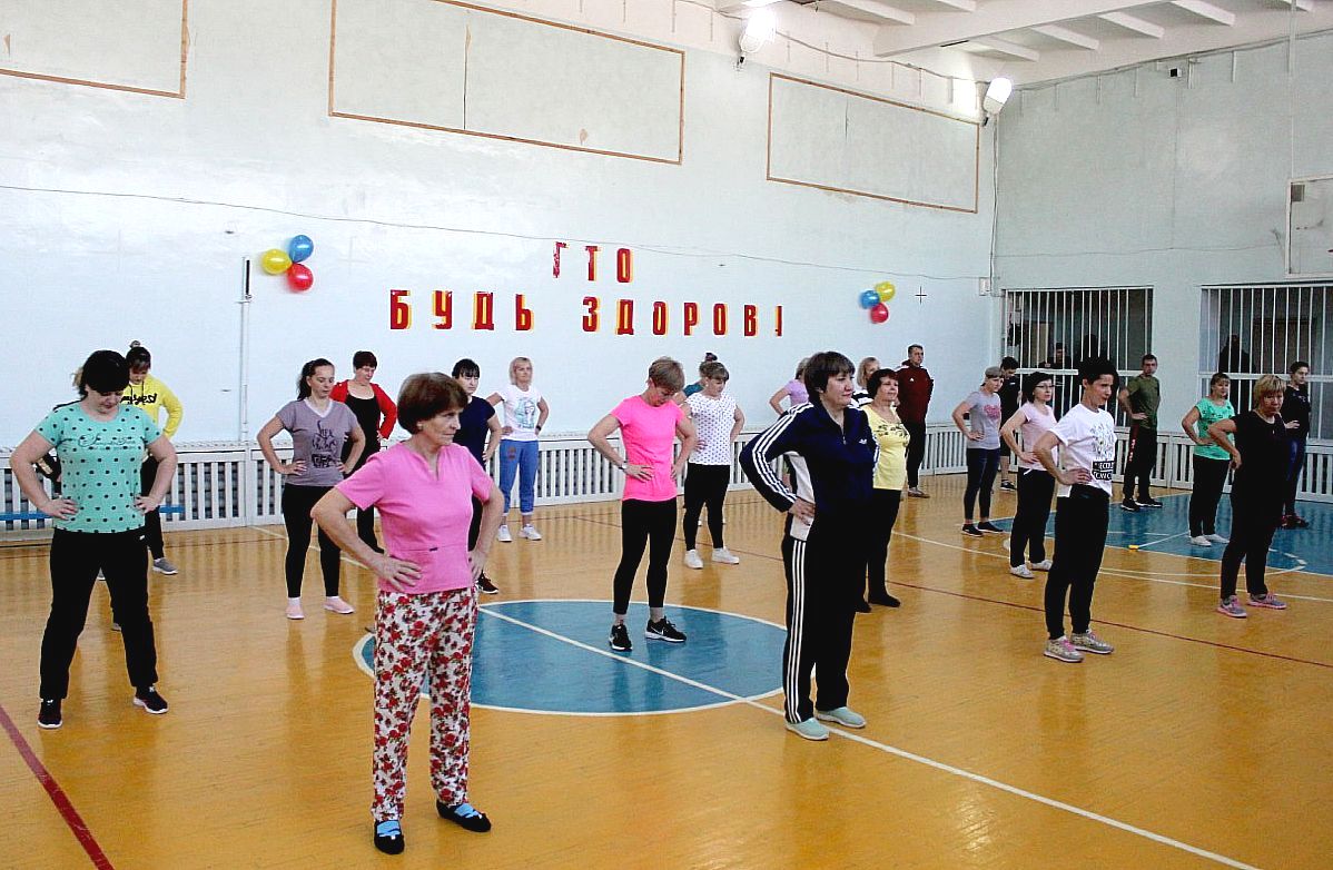 В разминке "ГТО! Будь здоров!" приняли участие взрослое население. Учителя, родители, активные жители города собрались в спортивном зале
