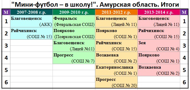 | 2 | Райчихинск (СОШ № 15) | 3:1 | 0:0 | 2:2 | 5:0 | 4 | 2 | 2 | 0 | 10 - 3 = 7 | 8 | |