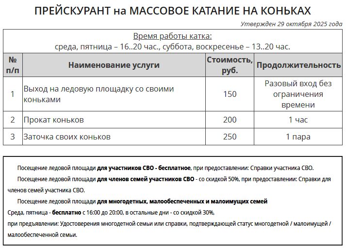 График работы и предлагаемые льготы для посещения главной арены Благовещенска, катка стадиона "Амур"
